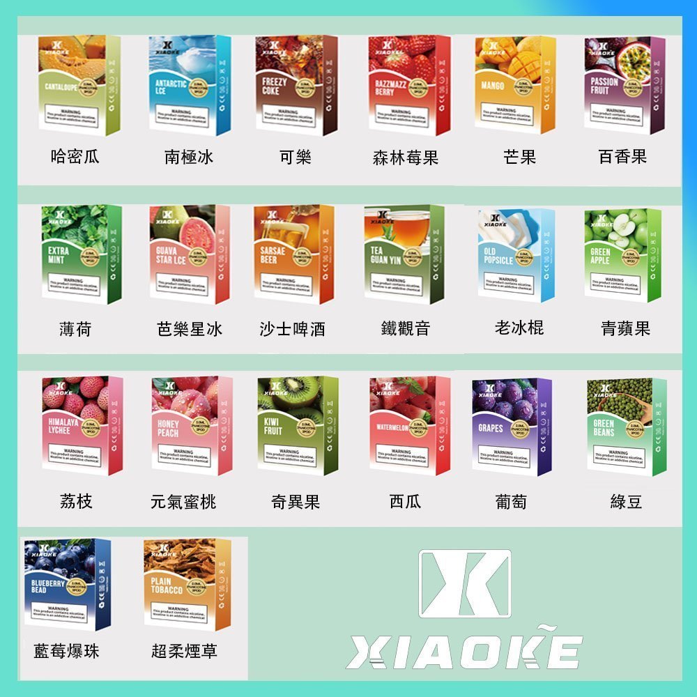 南極冰, 百香果, 薄荷, 可樂, 綠豆, 藍莓爆珠, 哈窑瓜, 老冰棍, 蜜桃, 奇異果, 芒果, 西瓜, 森林莓果, 芭粱, 荔枝, 沙士, 葡萄, 超柔菸草, 鐡觀音, 青蘋果